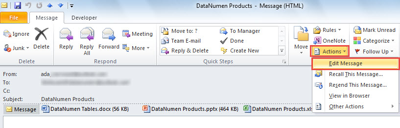 - Then, in the Message window, click “Actions” and select “Edit Message”.