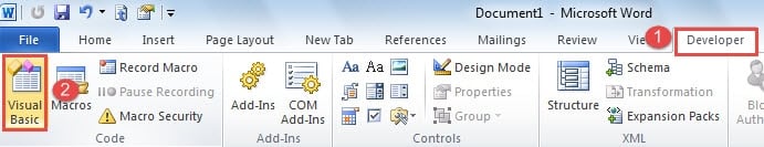 - Next, click “Visual Basic” to open the VBA editor. You can refer to How to Insert Background Music into Your Word Document to add “Developer” to the Ribbon. Or you can also press “Alt+ F11” instead if you prefer not to.