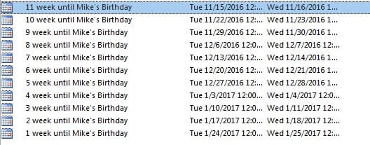 - Next you ought to input the corresponding subjects for countdown. Go to the last date in the sheet and type the subject line, such as “1 week until Mike’s Birthday”. In the penult date and type “2 week until Mike’s Birthday”. After that, select them and drag up. Excel will complete the series automatically.