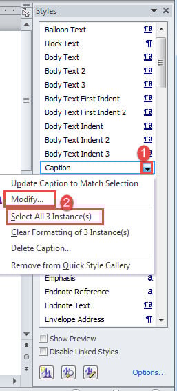 - Now all styles shall show on the “Styles” window. Find “Caption” and hover the cursor on it until you see an upside-down triangle button.