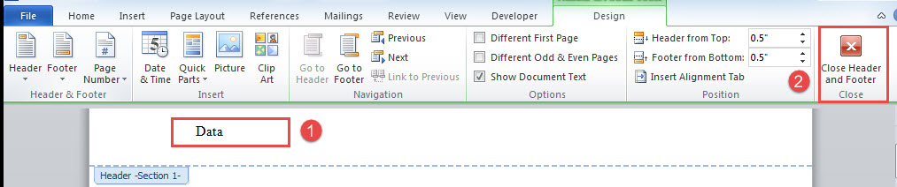 - Then replace text and click “Close Header and Footer” command to exit.