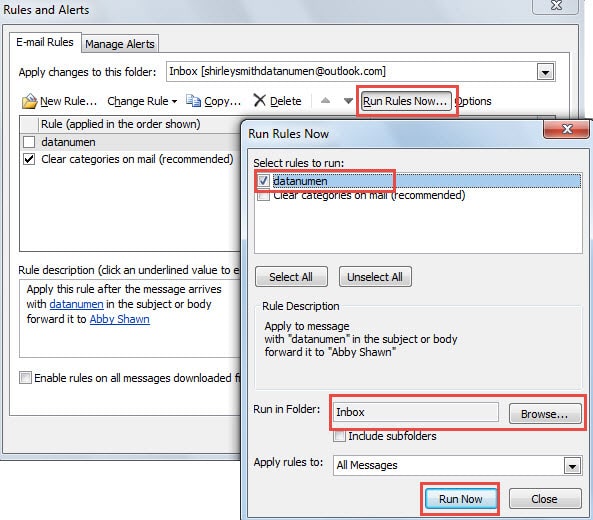 - Then in the “Rules and Alerts” dialog box, click “Run Rules Now”.
