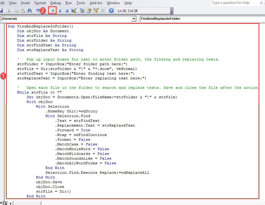 As you see, this macro provides you with 3 input boxes where you can enter folder path, the find and replacing texts. So you can assign a button for this macro and add it to the “Quick Access Toolbar” for reuse.