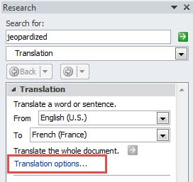 - Immediately you will see that the research pane shows up in the right side of the current window. You need to locate and hit “Translation Options” link in blue.